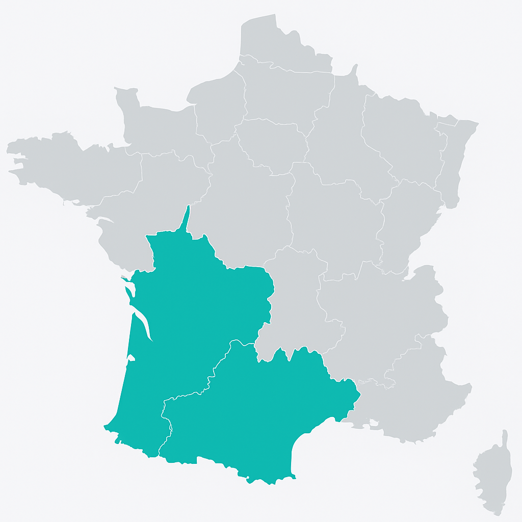 Chez 2B Environnement, nous intervenons rapidement et efficacement dans tout le Grand Sud-Ouest, principalement en Nouvelle-Aquitaine et en Occitanie. Notre organisation souple et réactive nous permet de couvrir un vaste territoire allant de la côte Atlantique jusqu’à l’intérieur des terres, y compris les zones urbaines et rurales.